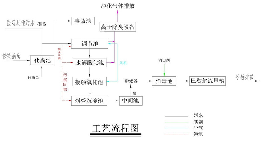 我公司严格执行标准:以《城镇污水处理厂污染物排放标准》(GB18918-2002)的规定一级B标准,采用A²O+沉淀+过滤的设计工艺,污水经格栅池去除较大的悬浮物后,进入一体化处理池,通过A²O工艺进行生化处理,去除COD、BOD5、氨氮等污染物。进入沉淀进行去除SS,之后进行过滤深度处理,处理后的水进入接触消毒池,进行消毒后达标排放。